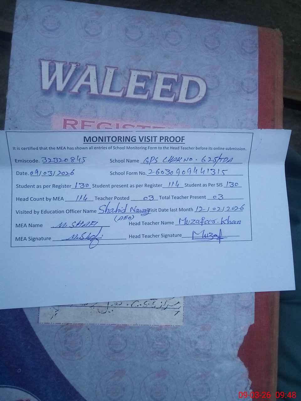 | EMIS Code: 32320845 | Name of School: GPS CHAK NO.625 TDA | |||