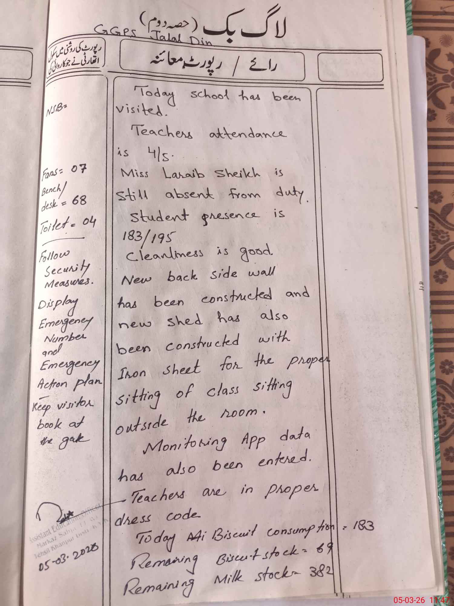 | Certified that this School was Inspected by the Undersigned MEA/DMO Today and the Information Stated Above is as Per Record. | |||||