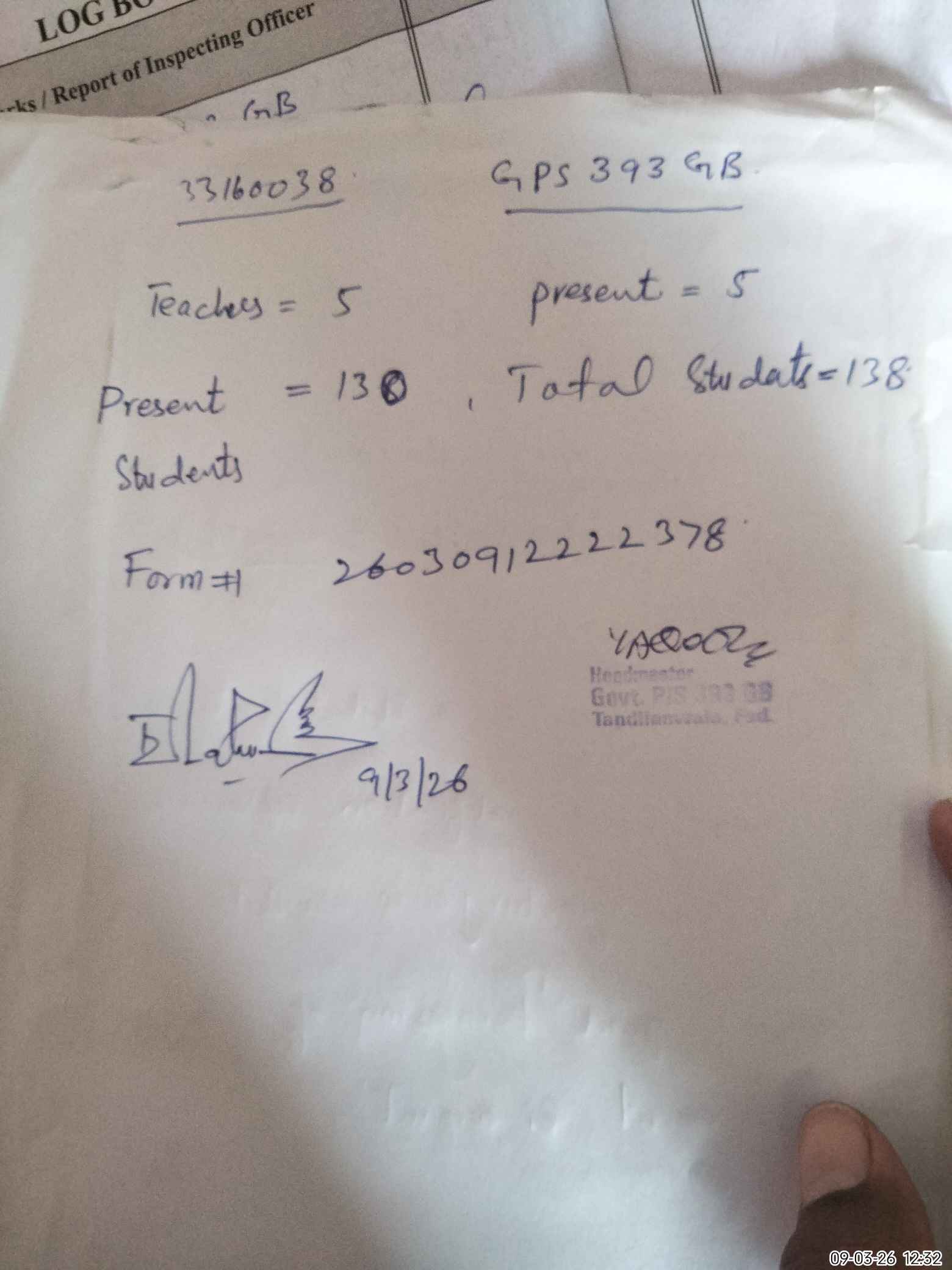 | EMIS Code: 33160038 | Name of School: GPS CHAK 393 GB TANDLIANWALA | |||