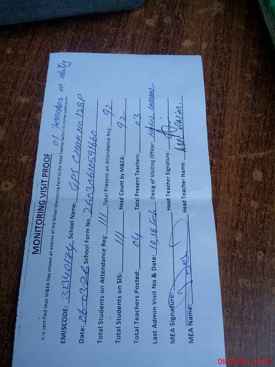 | Attendance Register | Head Teacher | MEA with School | Visit Proof |