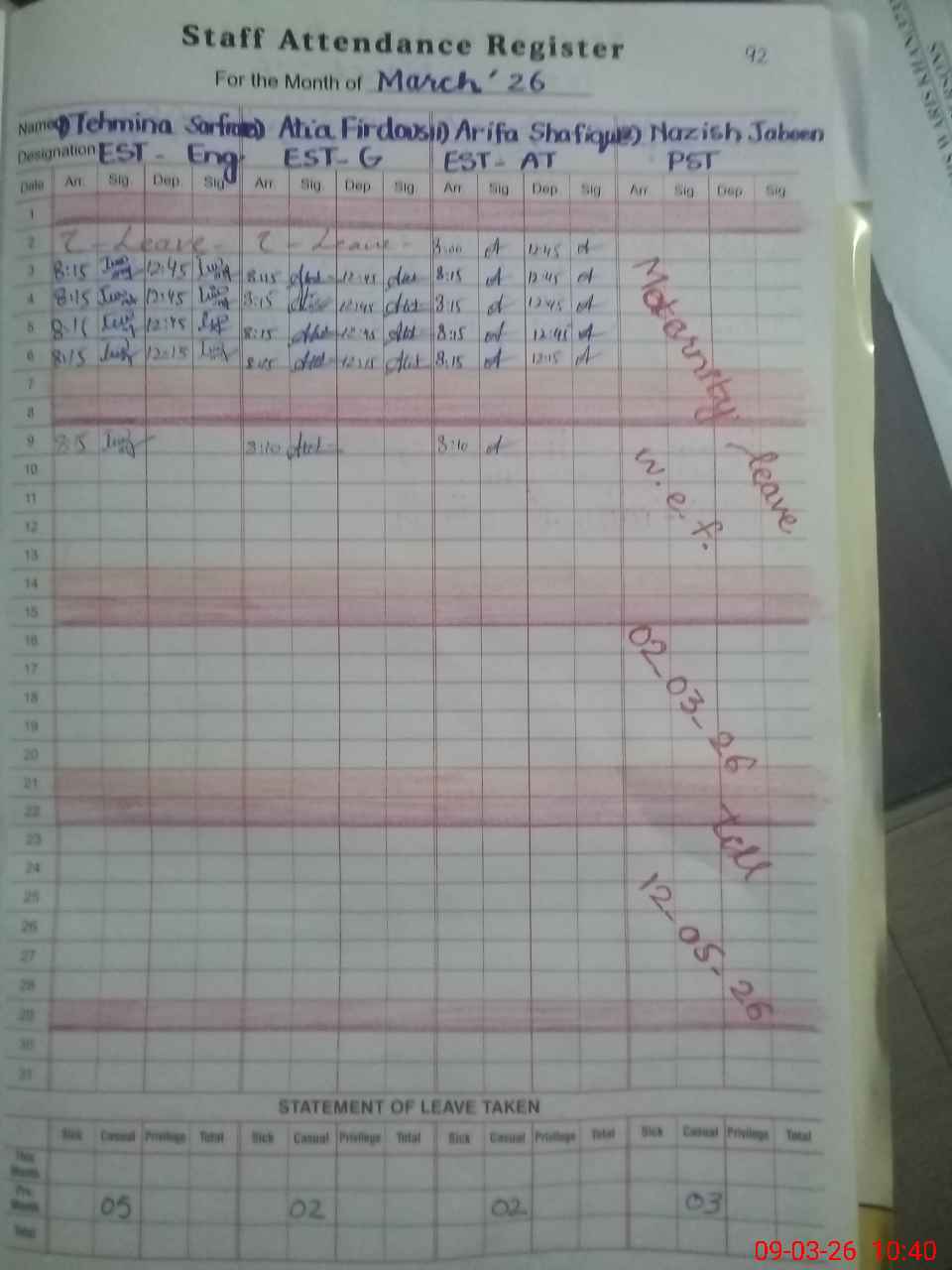 | 37**** | Na**** Ja**** | PST Arts | Regular | 0 | 0 | 0 | 0 | 0 | 0 | 0 | 0 | 0 | Maternity |