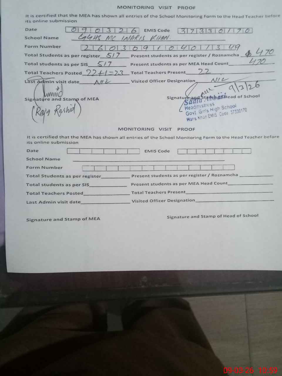| Remarks (Use Separate Page if Required): Teacher Sobia Nasir EST AT is physical present in school but her name is not shown in pimu app.Head teacher told that said teacher is posted out to GGES Khurram gujer texila but decision is still in court Nsb record is not updated on sis and pmiu app 08 teacher are without chair 12 students of ECE and Nur are sitting without furniture | |||||