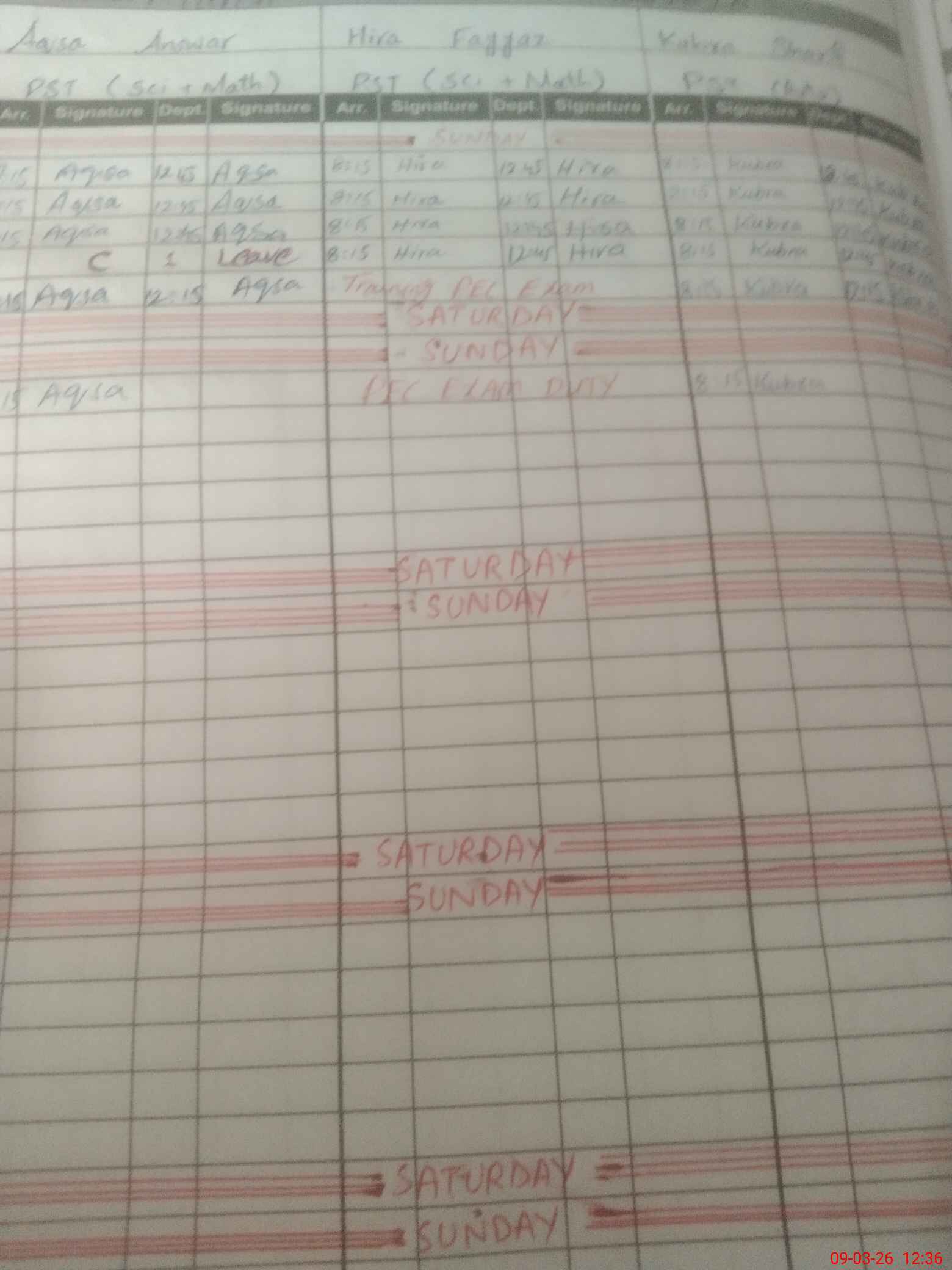 | 35**** | Za**** Af**** | PST Arts | Regular | 0 | 0 | 0 | 0 | 0 | 0 | 0 | 0 | 0 | Exam Duty |