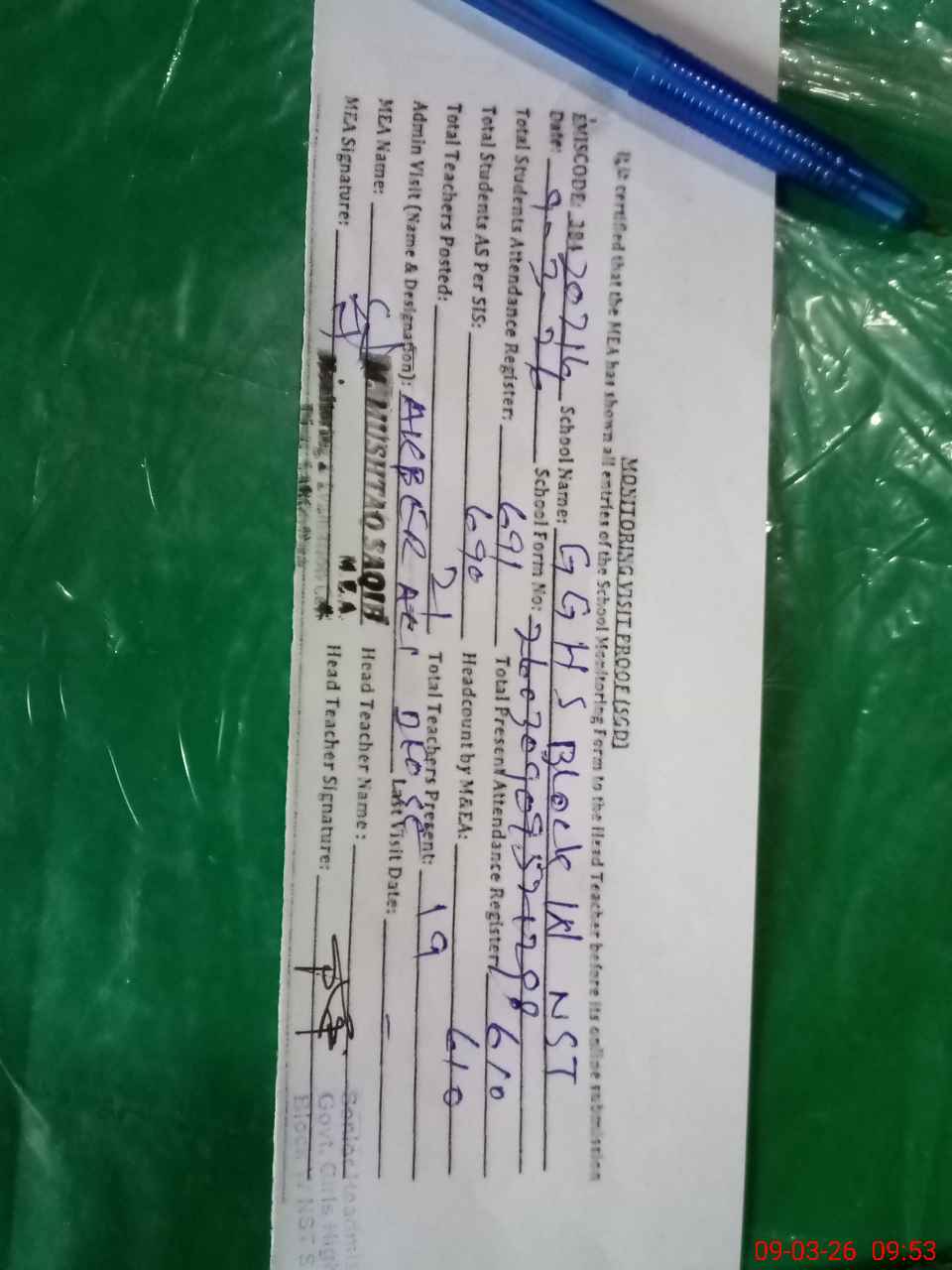 | Attendance Register | Head Teacher | MEA with School | Visit Proof |
