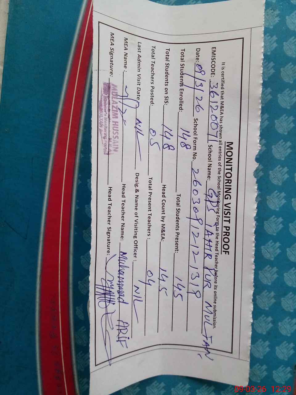 | EMIS Code: 36120071 | Name of School: GPS TAHIR PUR P/O & TEH.SHUJABAD | |||