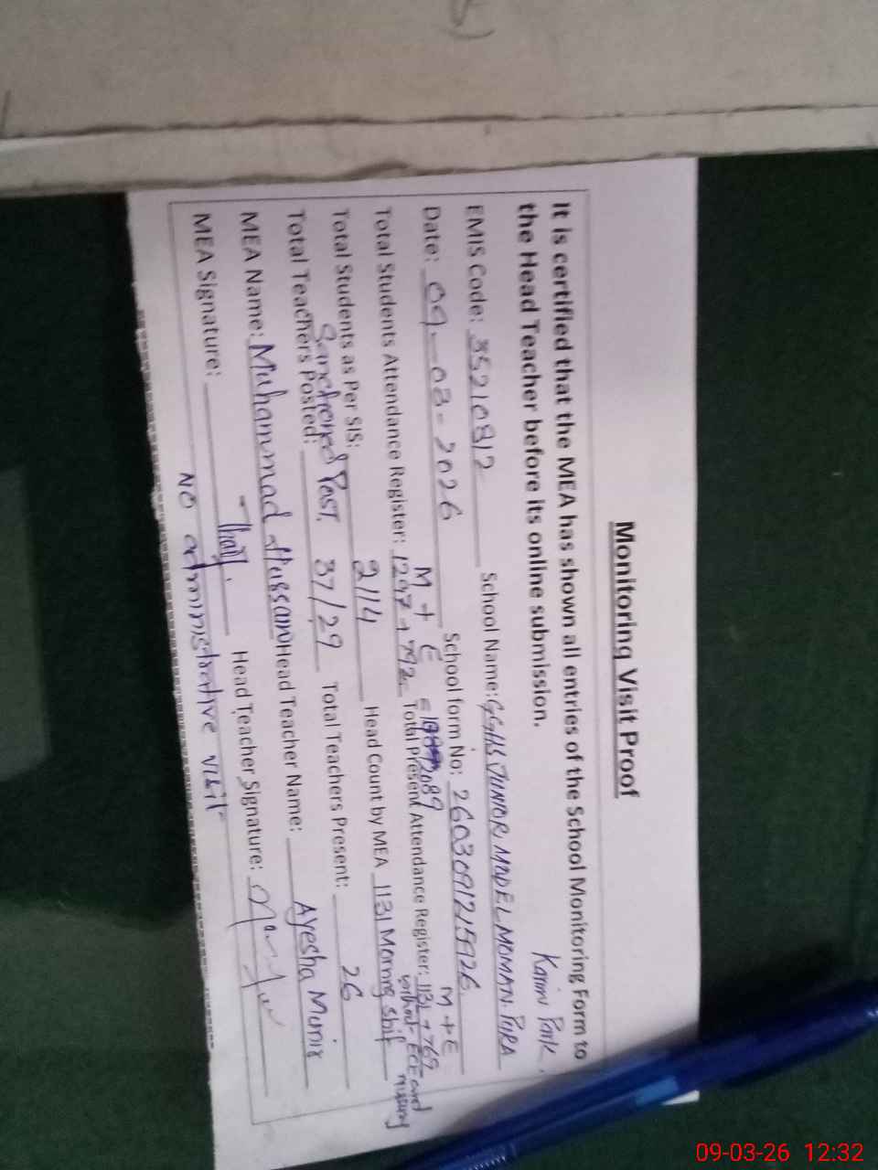 | Remarks (Use Separate Page if Required): 1 Saiqa Ali pst teacher removal from service vide order no 2222 /lit dated 2-10-2025 but still her name not deleted from pmiu teachers list 2 Mehak Riaz SST IT absent from duty since 15-8-2025 3 No adminstrative visit since long time 4 Annual exam started and ECE class students and prep class students no paper to day and students not present in school total enrollments of students entered but present mark zero | |||||