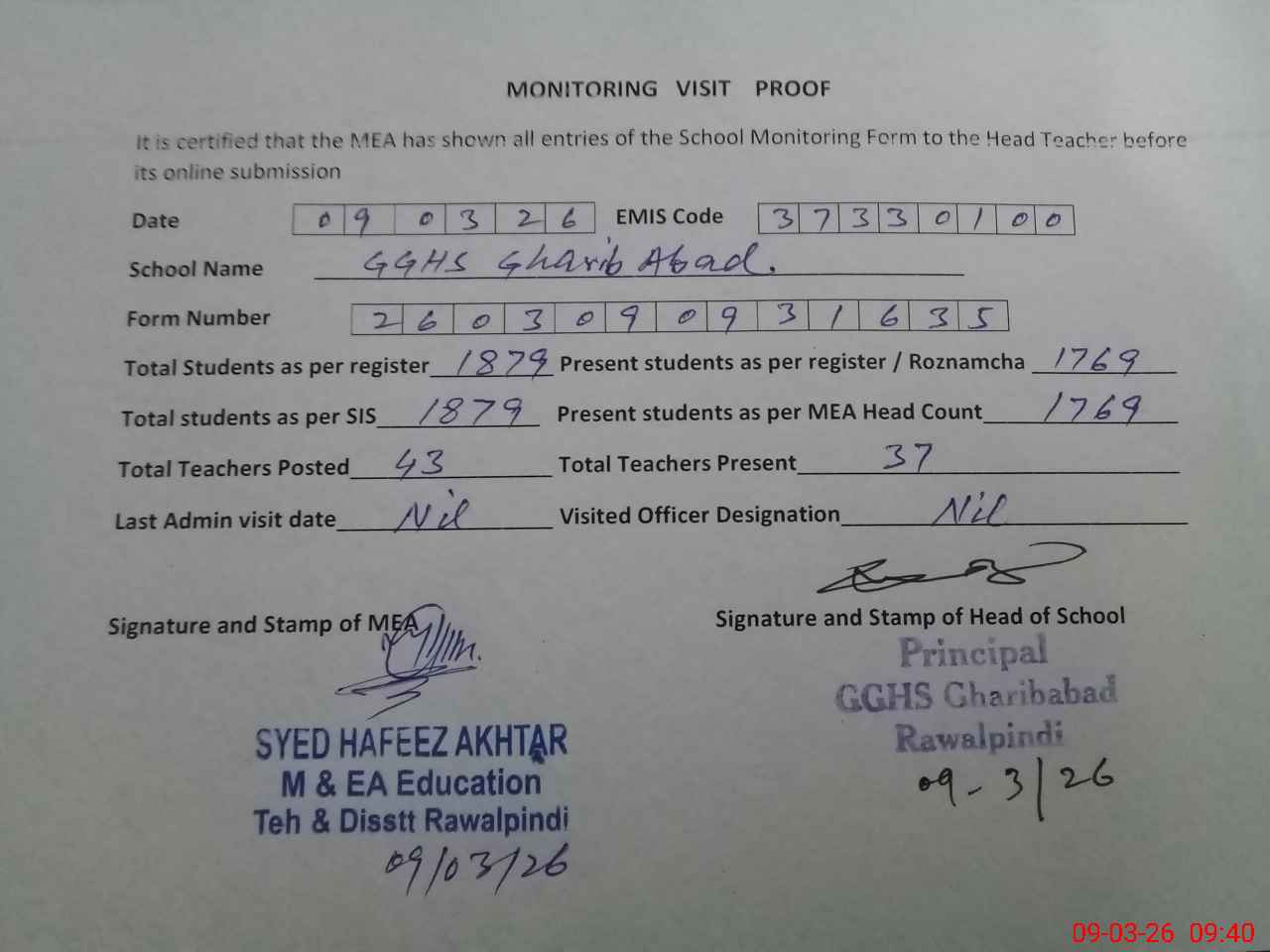 | Certified that this School was Inspected by the Undersigned MEA/DMO Today and the Information Stated Above is as Per Record. | |||||