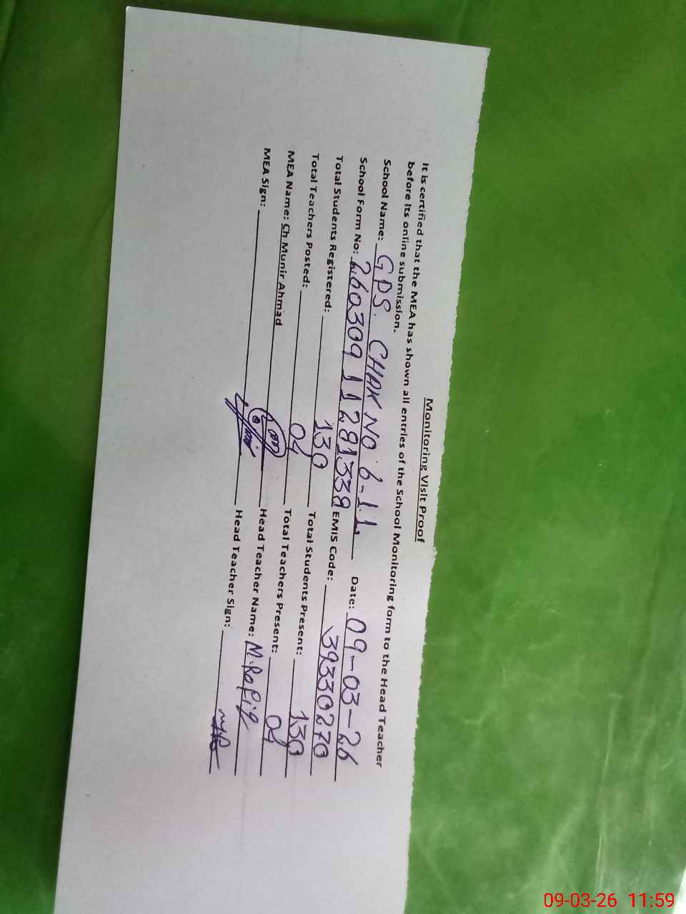 | Attendance Register | Head Teacher | MEA with School | Visit Proof |