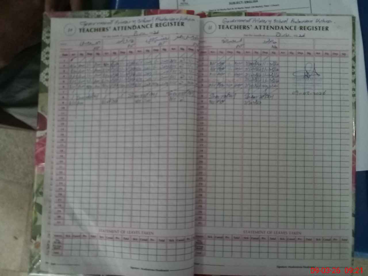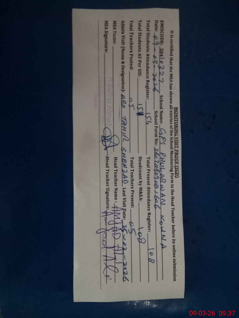 | Attendance Register | Head Teacher | MEA with School | Visit Proof |