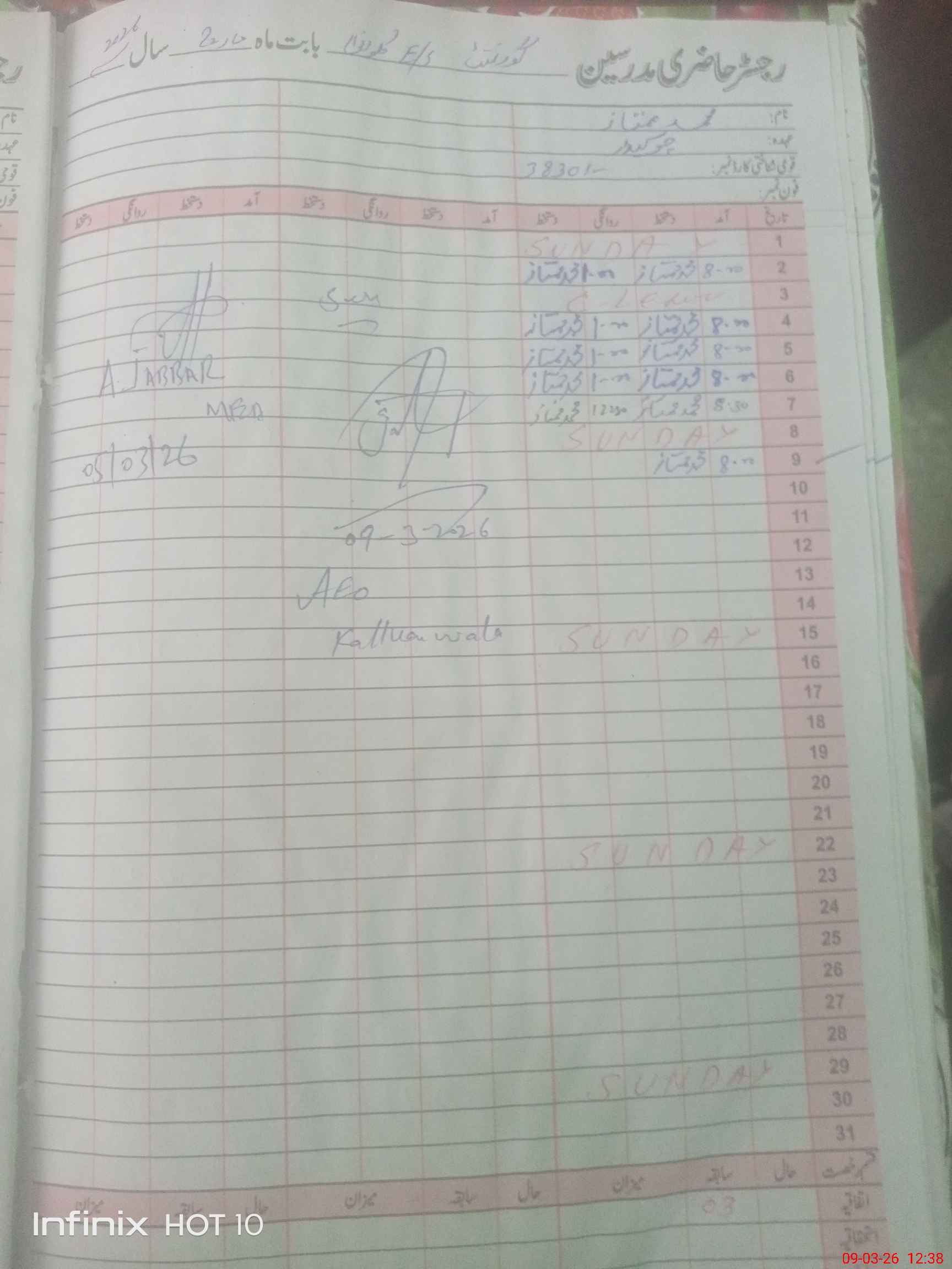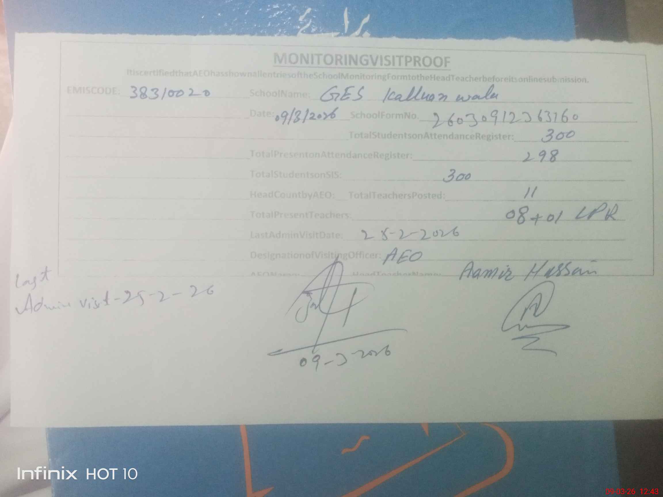 | Name: Aa**** Hu**** Designation: (School Headmaster's/Headmistress's) EST Phone/Cell Number: 03**** |