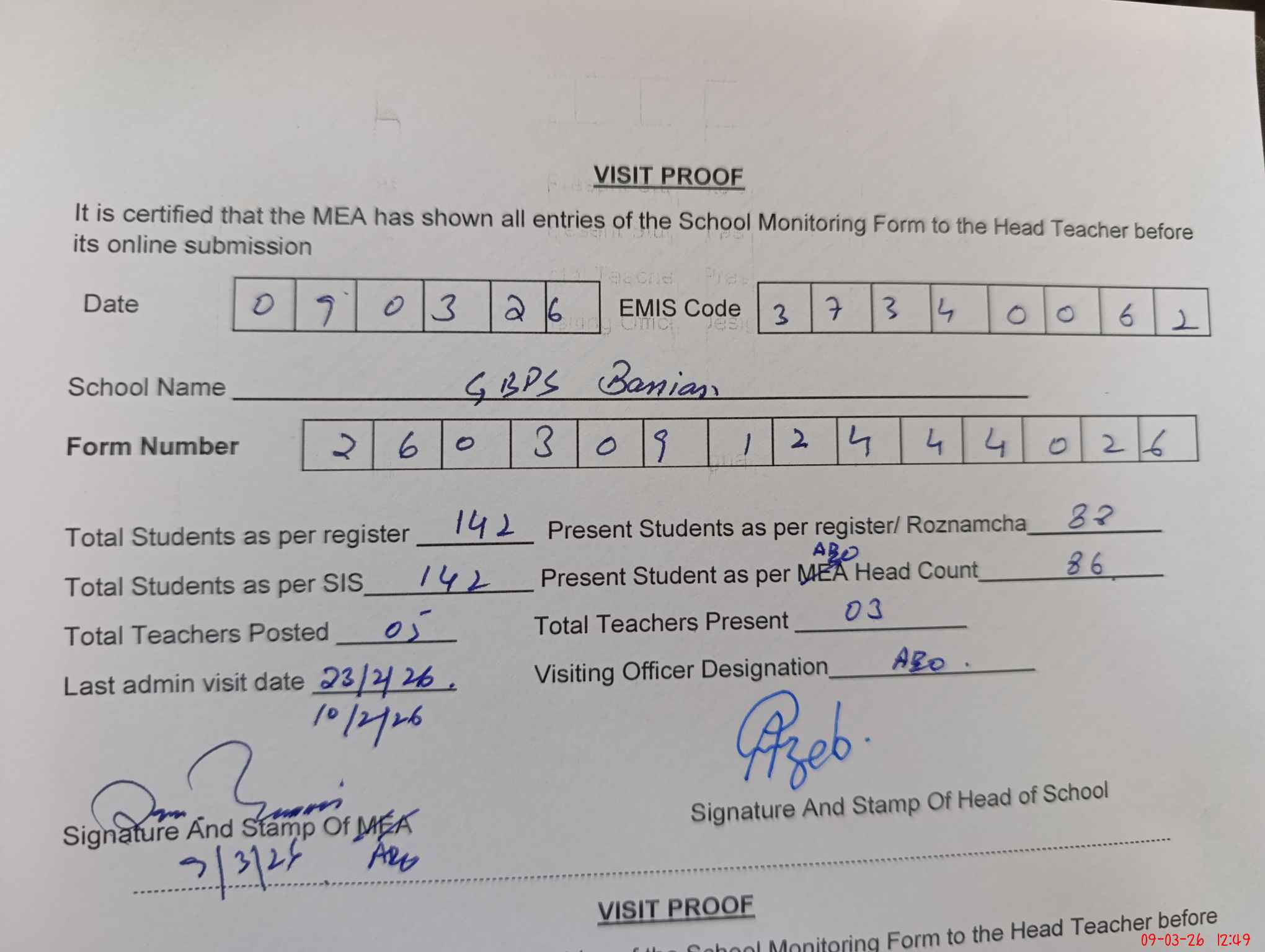 | Attendance Register | Head Teacher | MEA with School | Visit Proof |