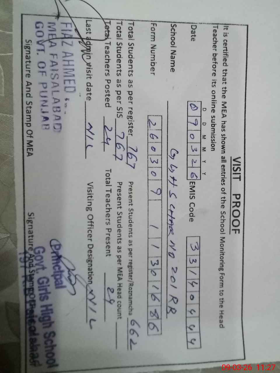 | Certified that this School was Inspected by the Undersigned MEA/DMO Today and the Information Stated Above is as Per Record. | |||||