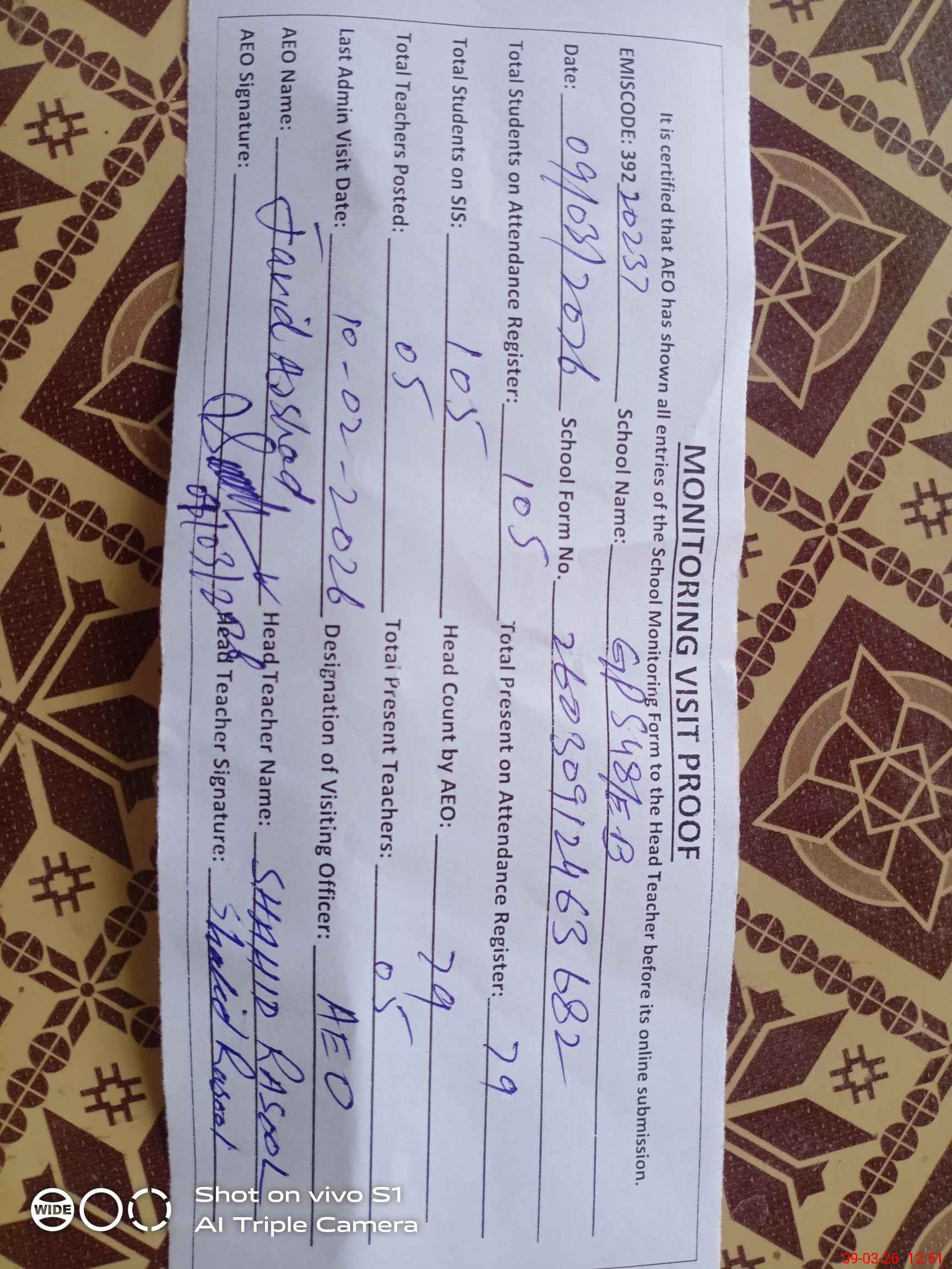 | Attendance Register | Head Teacher | MEA with School | Visit Proof |