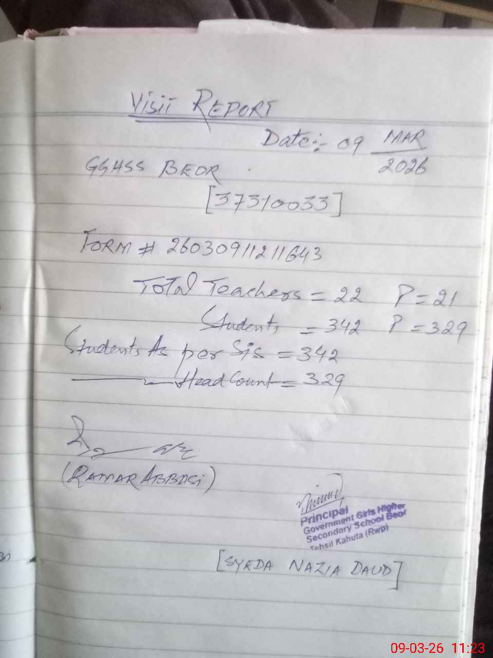 | Name: Sy**** Na**** Da**** Designation: (School Headmaster's/Headmistress's) Principal Phone/Cell Number: 03**** |