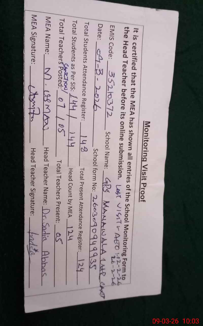 | EMIS Code: 35210372 | Name of School: GPS MANAWALA LHR CANTT | |||