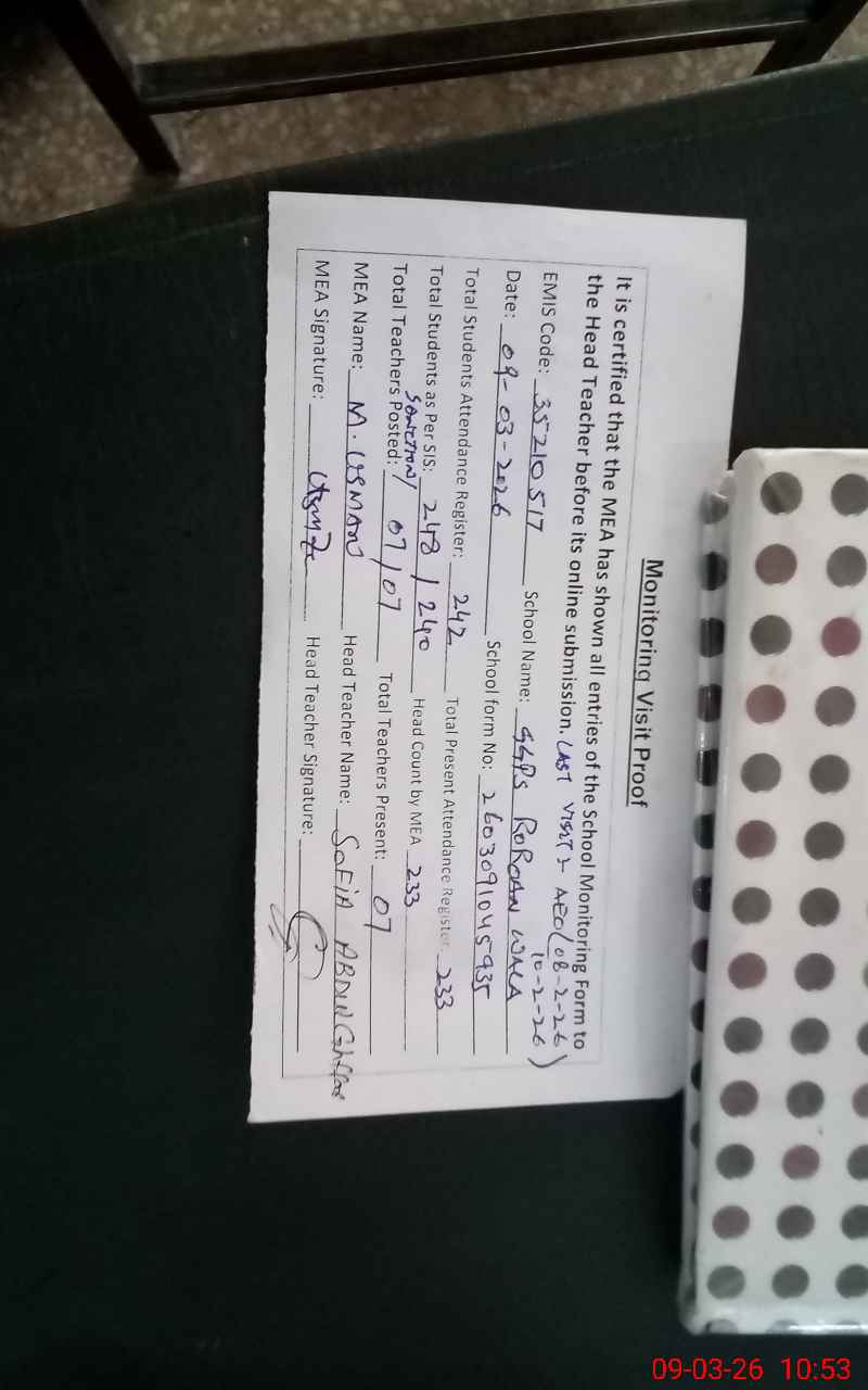 | Remarks (Use Separate Page if Required): NSB and FTF record was not correct Shortage of furniture for 15 students 01 class room is under construction since December,2025. 01 wash room was nonfunctional due to blocked. | |||||