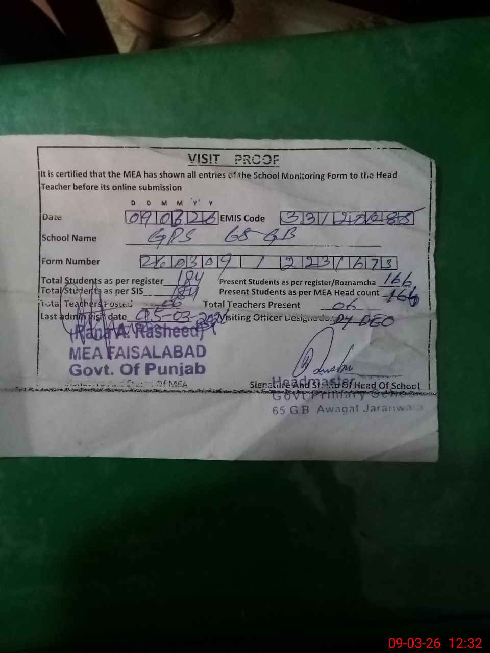 | Attendance Register | Head Teacher | MEA with School | Visit Proof |