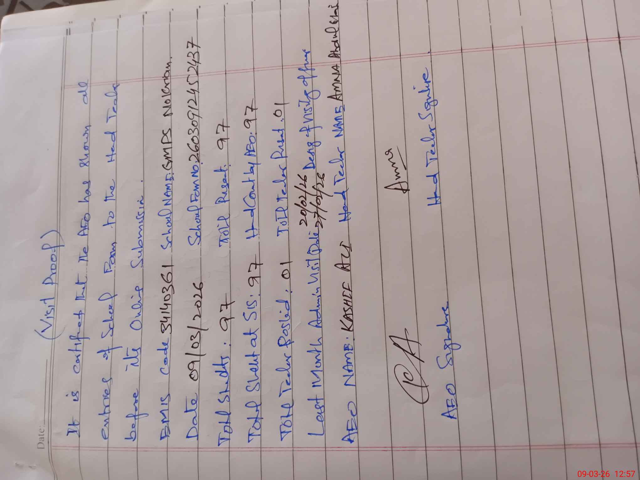 | Attendance Register | Head Teacher | MEA with School | Visit Proof |