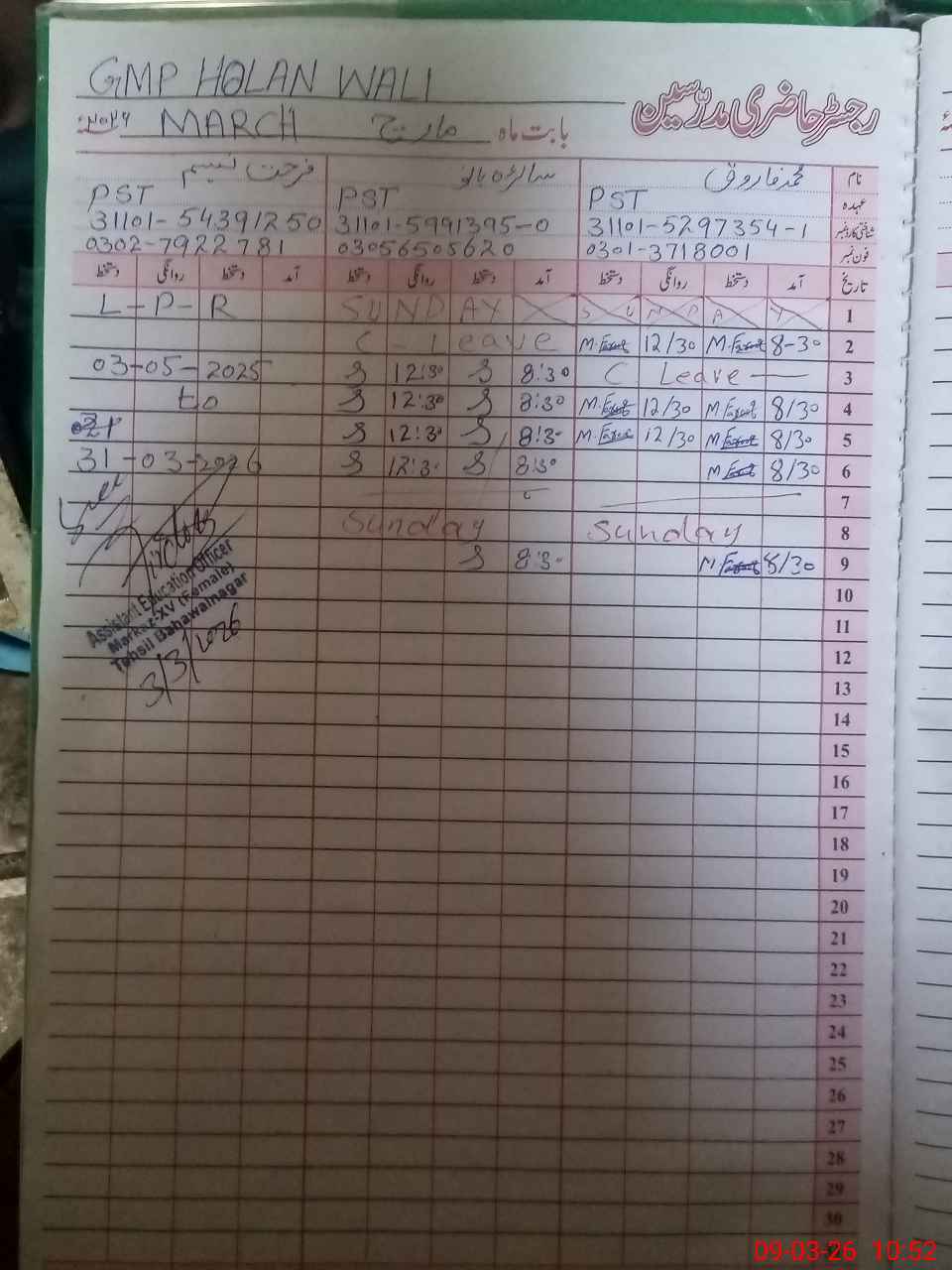 | CNIC | Full Name | Designation | R/C | Absence During Last Calender Month |