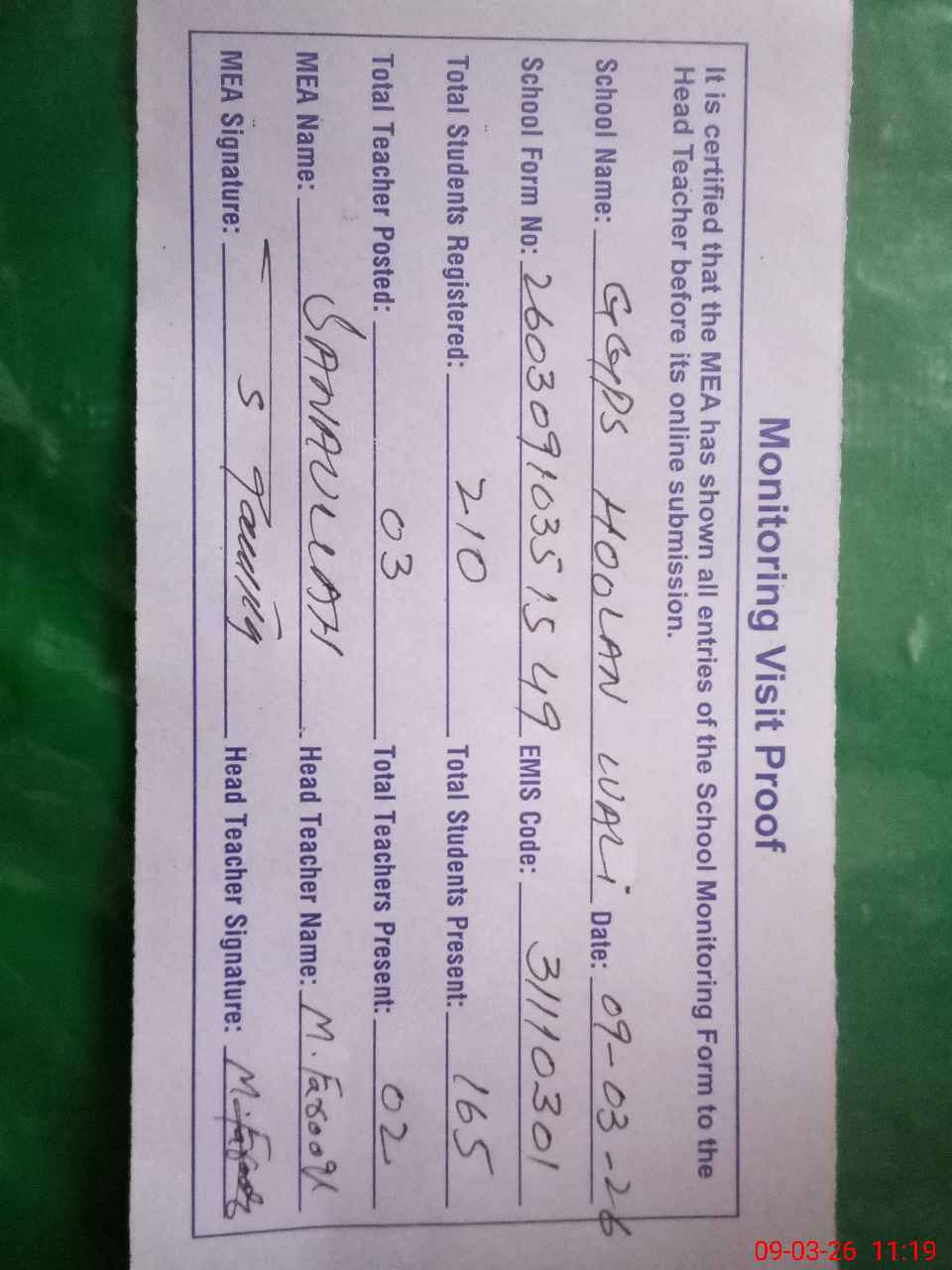 | Attendance Register | Head Teacher | MEA with School | Visit Proof |