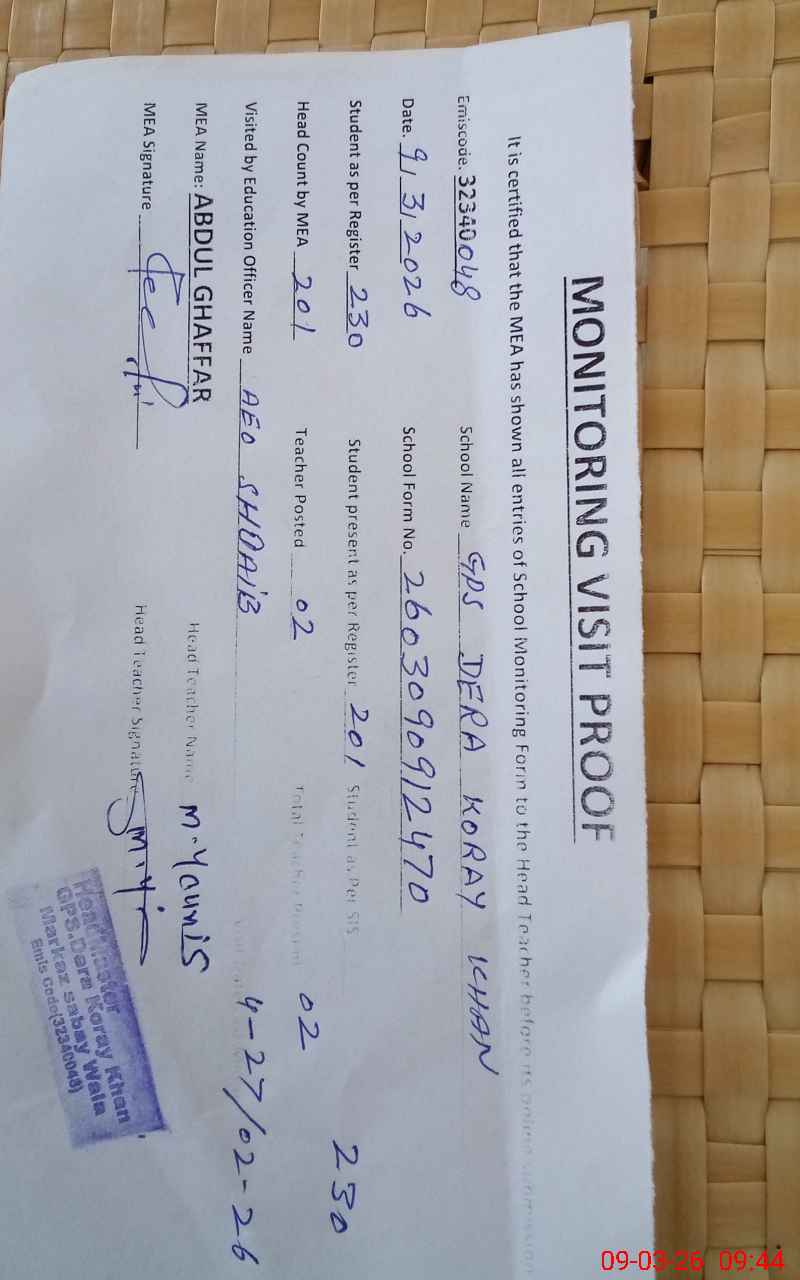 | EMIS Code: 32340048 | Name of School: GPS DERA KORAY KHAN | |||