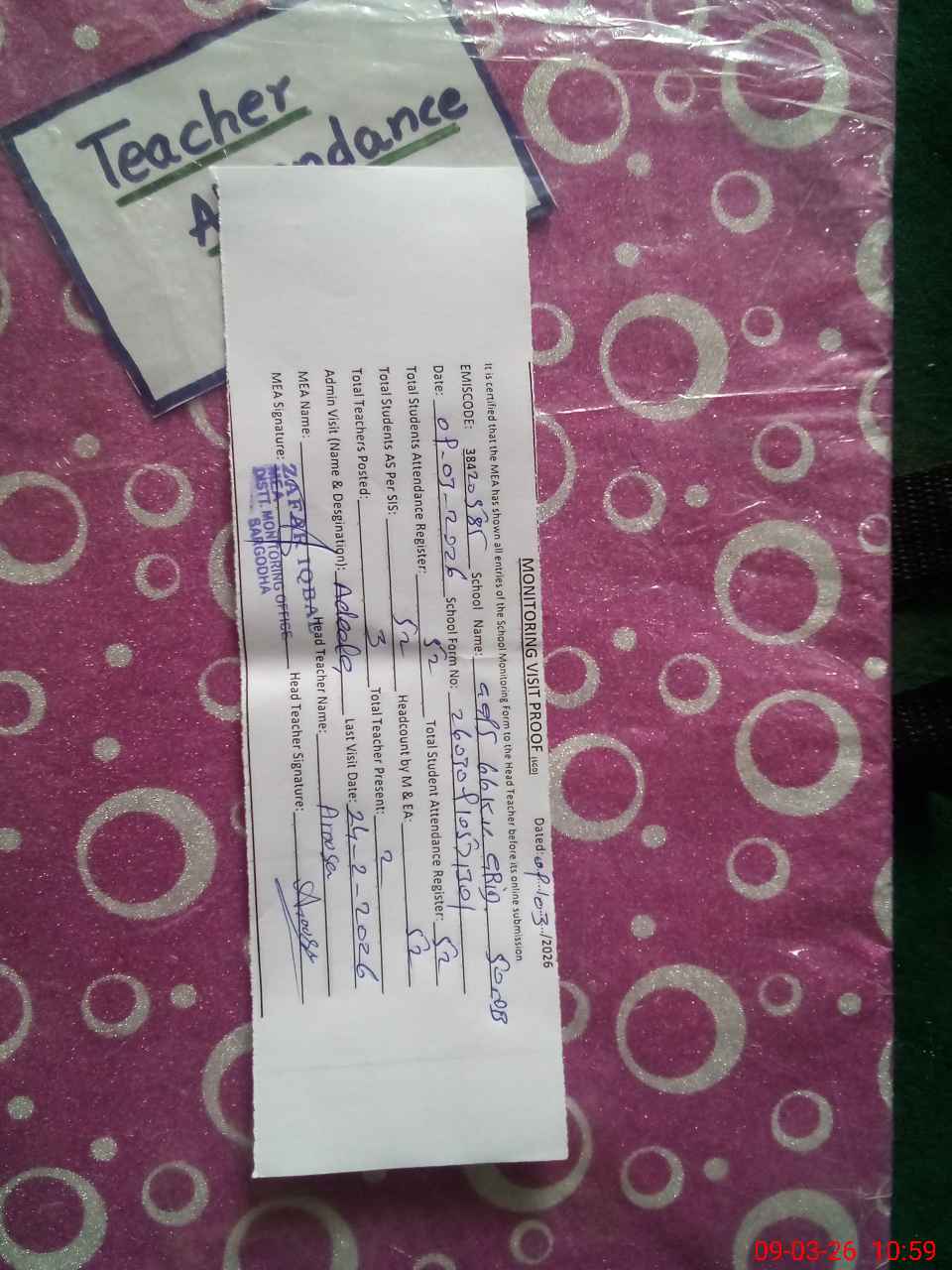 | Attendance Register | Head Teacher | MEA with School | Visit Proof |
