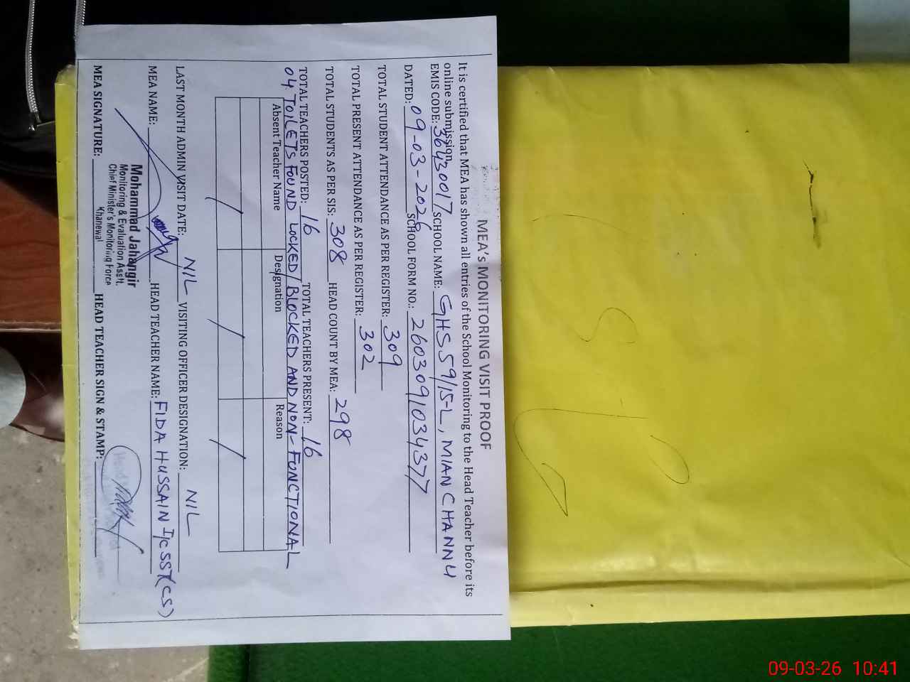 | Remarks (Use Separate Page if Required): NSB GRANTS RECORDS ARE NOT MAINTAINED BANK STATEMENTS UPTO 30 DECEMBER 2025 IS AVAILABLE AFTER THIS NO STATEMENTS FTF RECORDS ARE ALSO NOT MAINTAINED BANK STATEMENTS UPTO 30 JUNE 2025 IS AVAILABLE AFTER THIS NO STATEMENTS FOUR TOILETS FOUND LOCKED BLOCKED AND NON FUNCTONAL | |||||