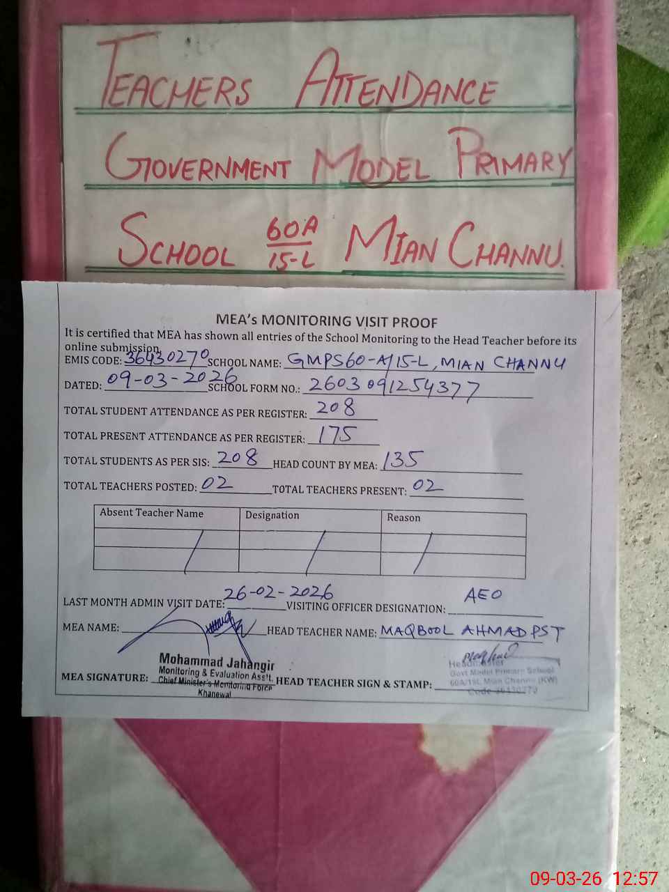 | EMIS Code: 36430270 | Name of School: GMPS 60-A/15-L, MIAN CHANNU | |||