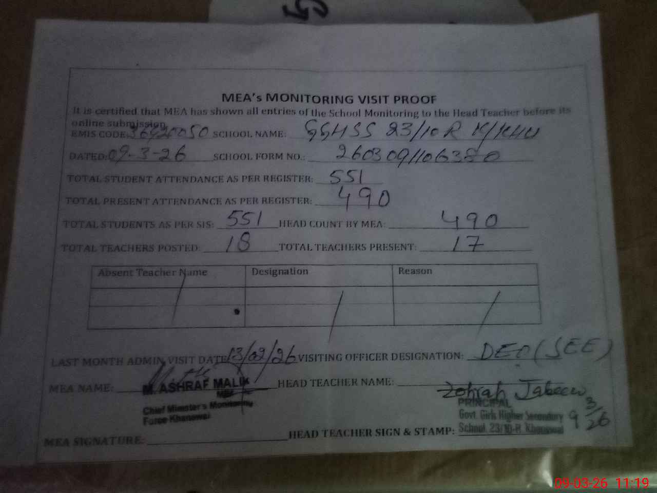 | Attendance Register | Head Teacher | MEA with School | Visit Proof |
