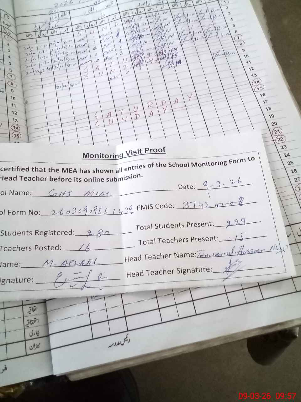 | Attendance Register | Head Teacher | MEA with School | Visit Proof |