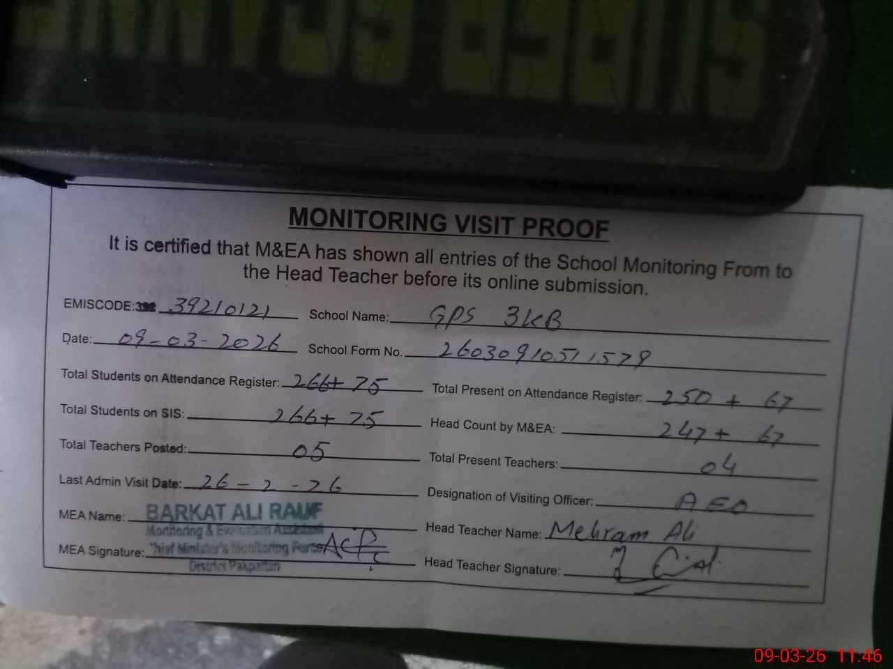 | Attendance Register | Head Teacher | MEA with School | Visit Proof |