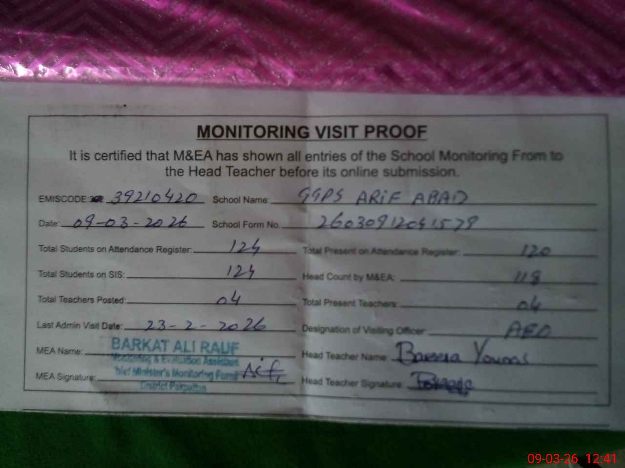 | EMIS Code: 39210420 | Name of School: GGPS ARIF ABAD | |||