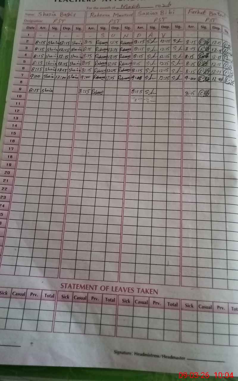| Name: SH**** BA**** Designation: (School Headmaster's/Headmistress's) PST Phone/Cell Number: 03**** |