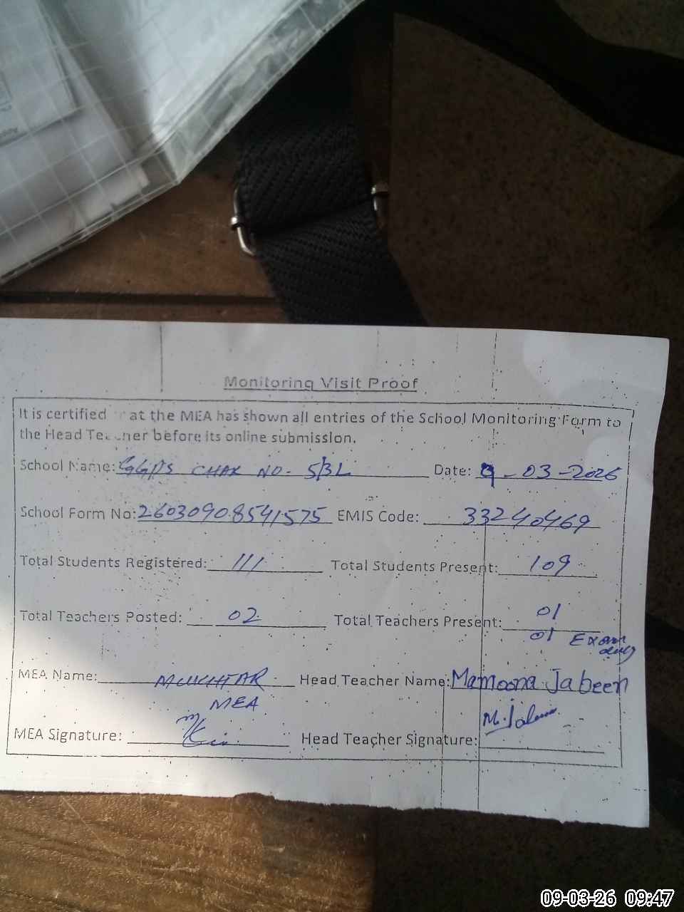 | Attendance Register | Head Teacher | MEA with School | Visit Proof |
