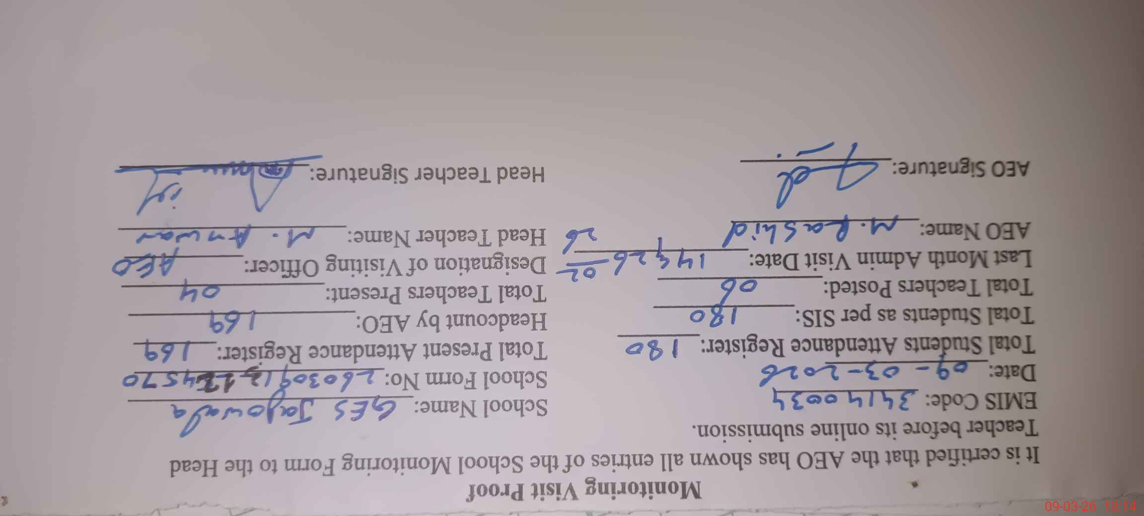 | Certified that this School was Inspected by the Undersigned MEA/DMO Today and the Information Stated Above is as Per Record. | |||||