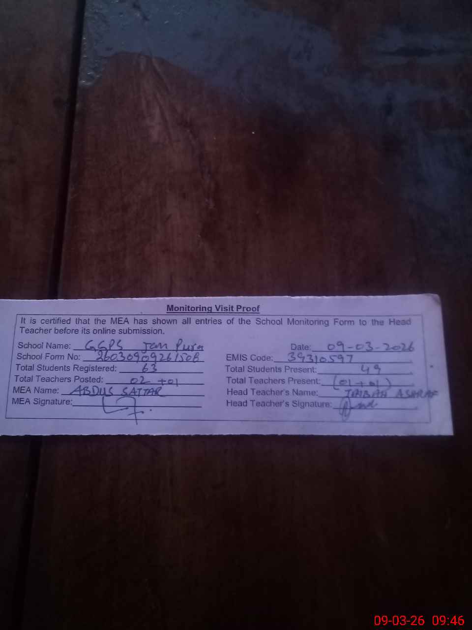| Attendance Register | Head Teacher | MEA with School | Visit Proof |