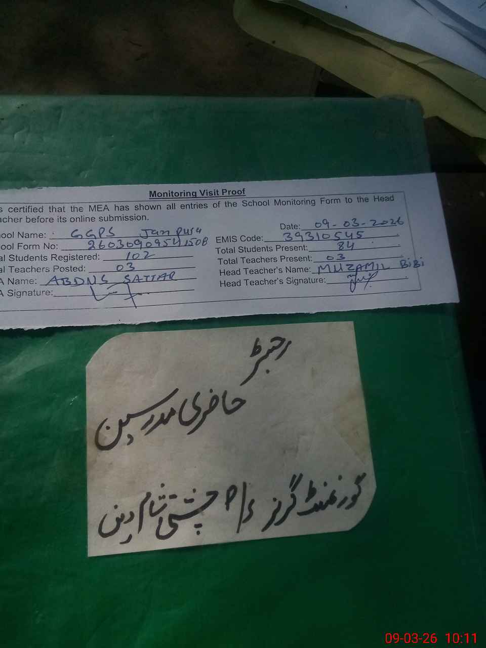 | Attendance Register | Head Teacher | MEA with School | Visit Proof |