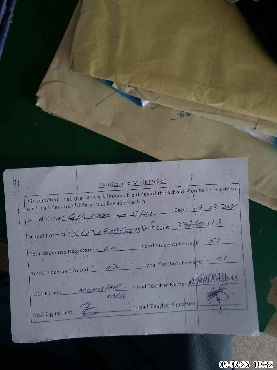 | Attendance Register | Head Teacher | MEA with School | Visit Proof |