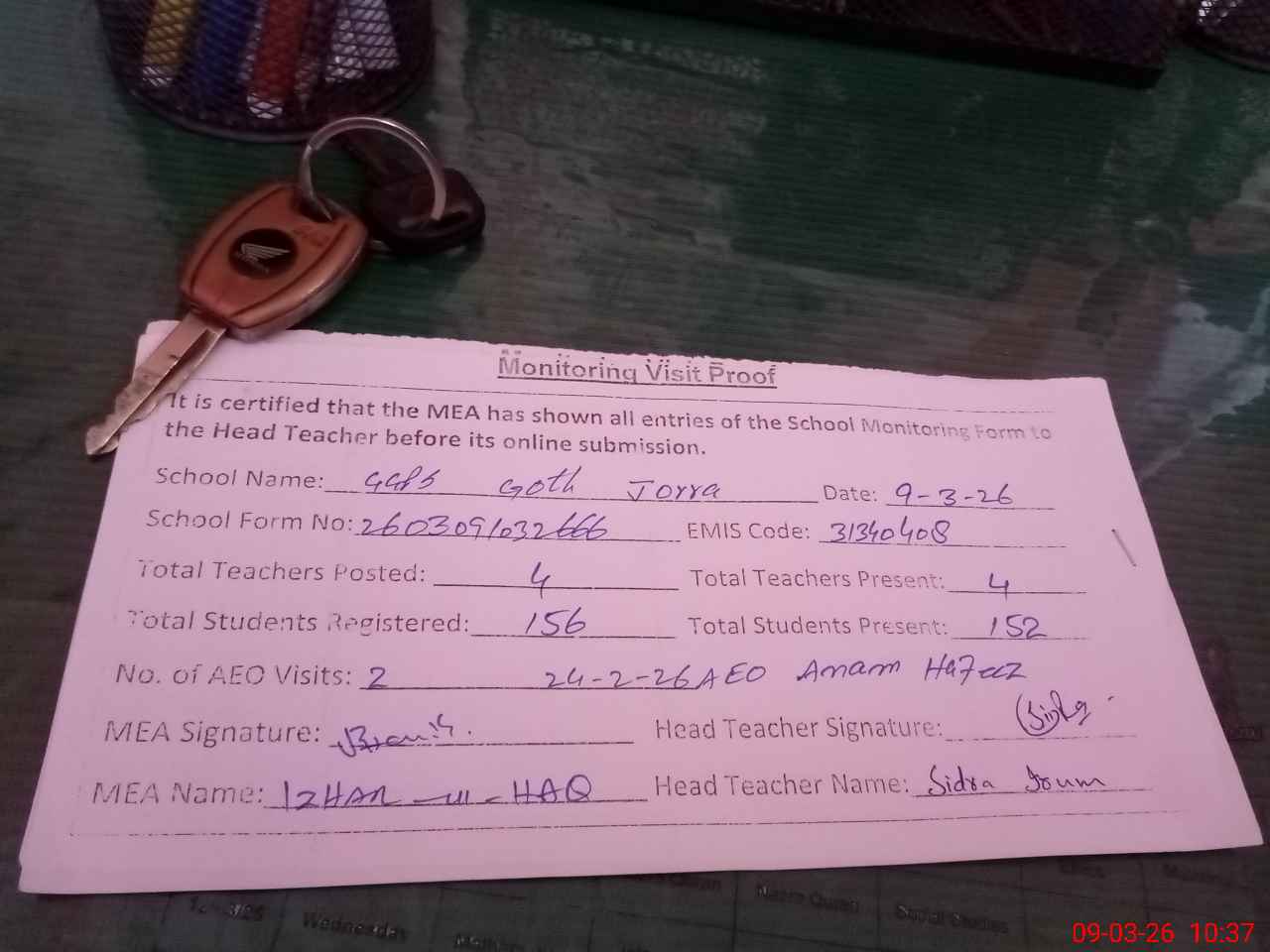 | Monitoring Date: 09-03-2026 | Start Time: 09-03-2026 10:00 AM | End Time: 09-03-2026 10:41 AM | Name of MEA: Mu**** Iz**** UlHa**** | |