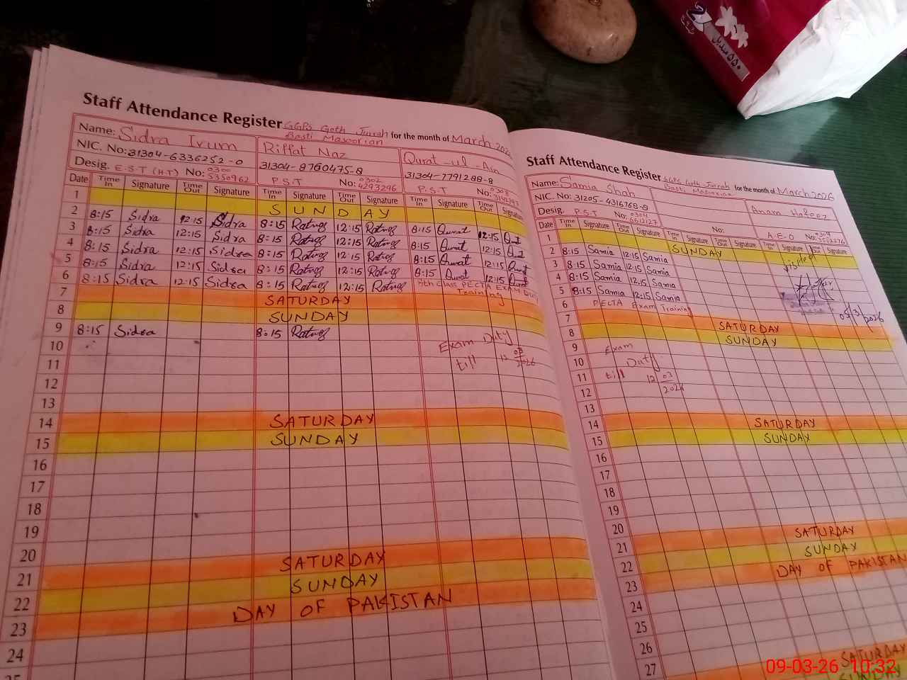 | CNIC | Full Name | Designation | R/C | Absence During Last Calender Month |