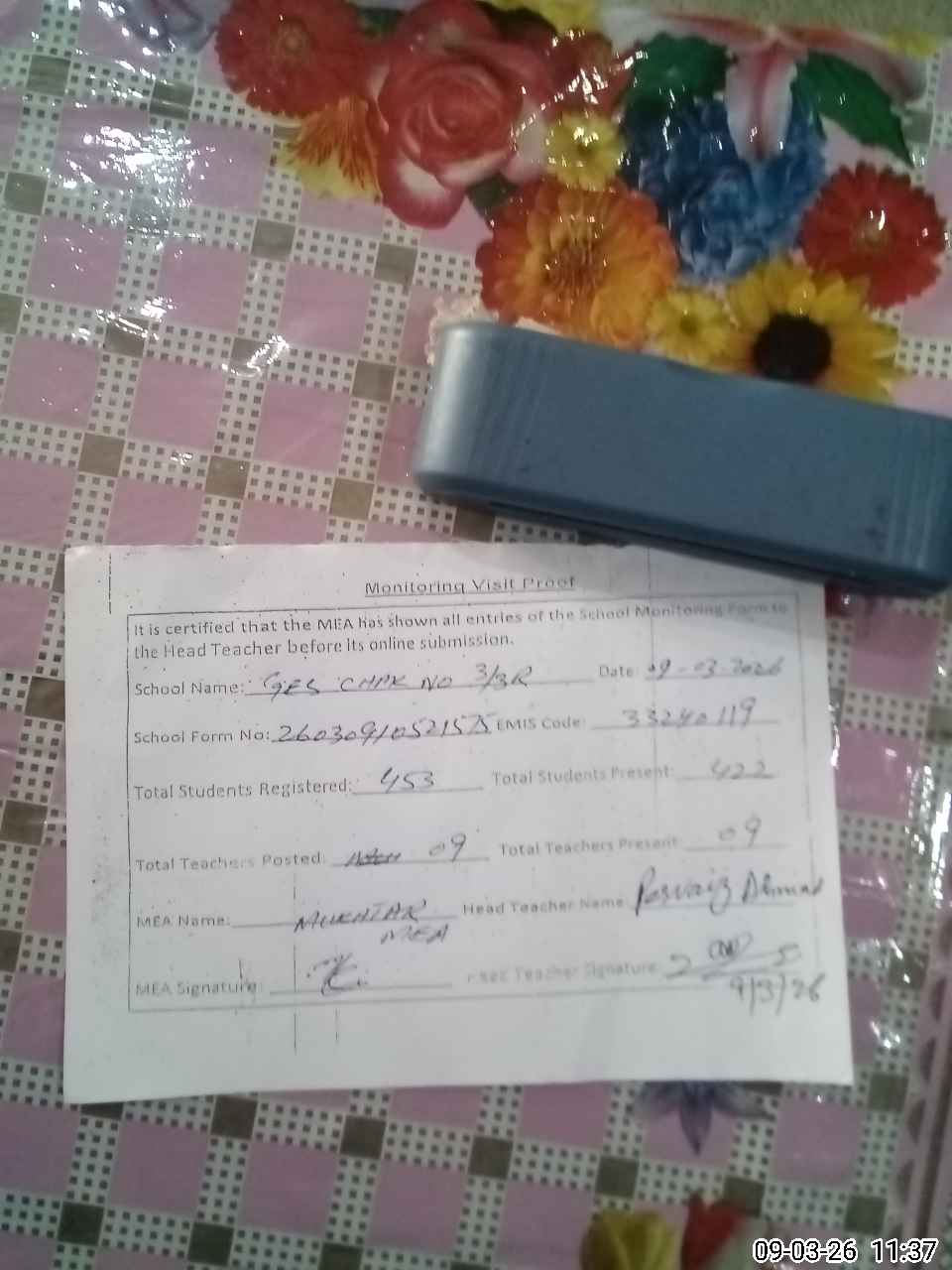 | Attendance Register | Head Teacher | MEA with School | Visit Proof |