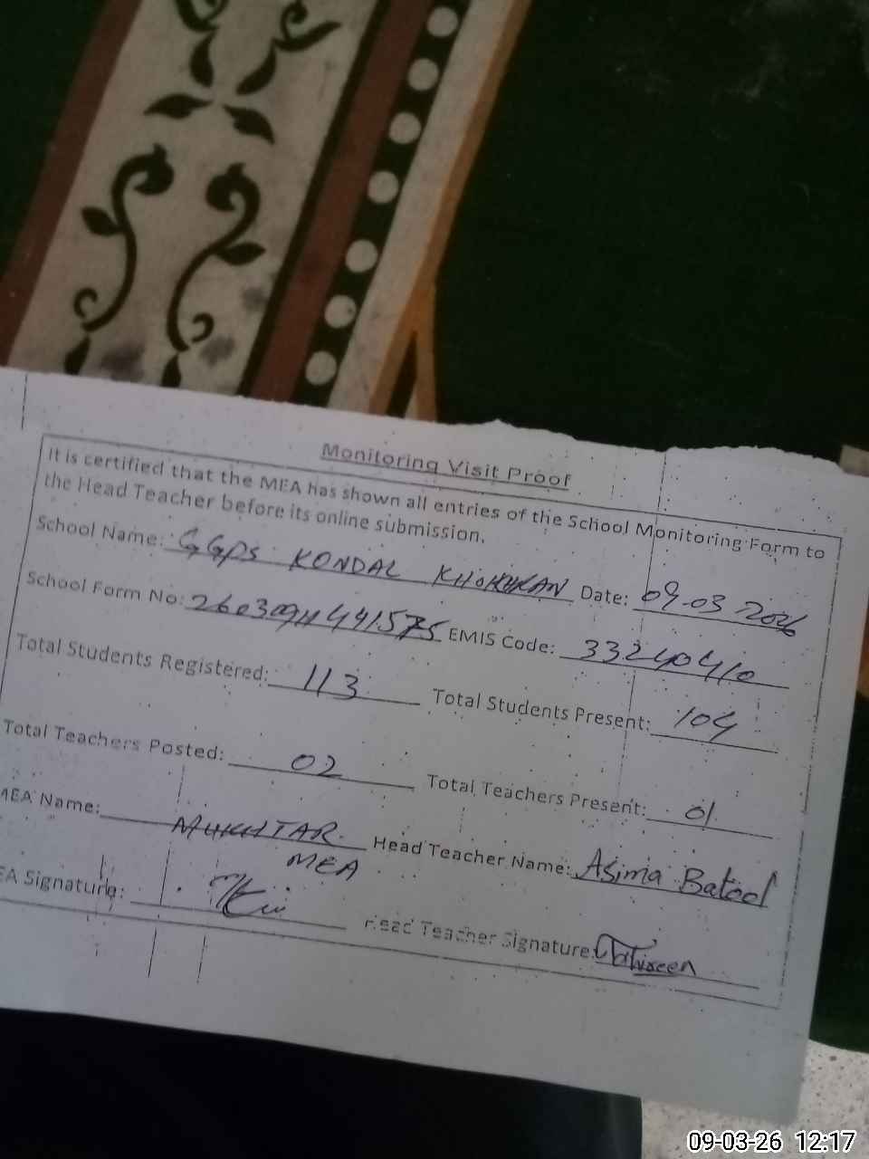| Attendance Register | Head Teacher | MEA with School | Visit Proof |