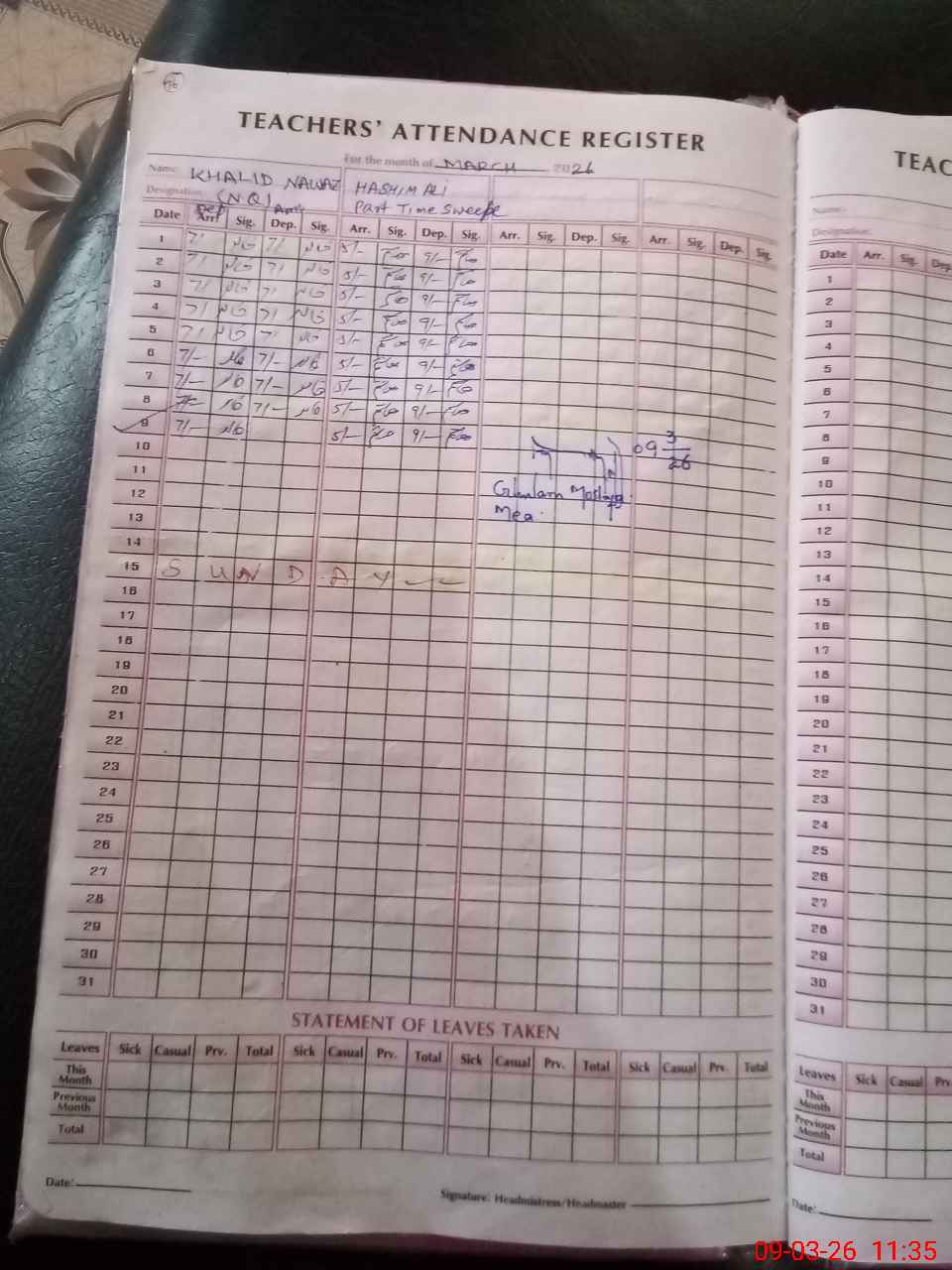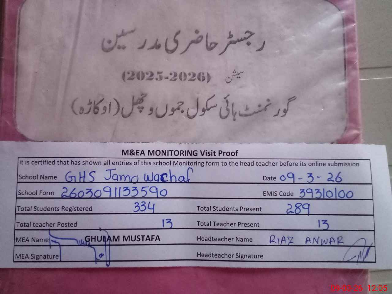 | Remarks (Use Separate Page if Required): It is being submitted that today as on 09 March, 2026 the annual examination is being continue, the maximum students left the school after appearing the exam. Therefore the attendance column is being filled keeping in view the attendance of students in their respective exams etc. The boundary wall about 175 rf found missing as the school building bounded by its neighbours walls. | |||||