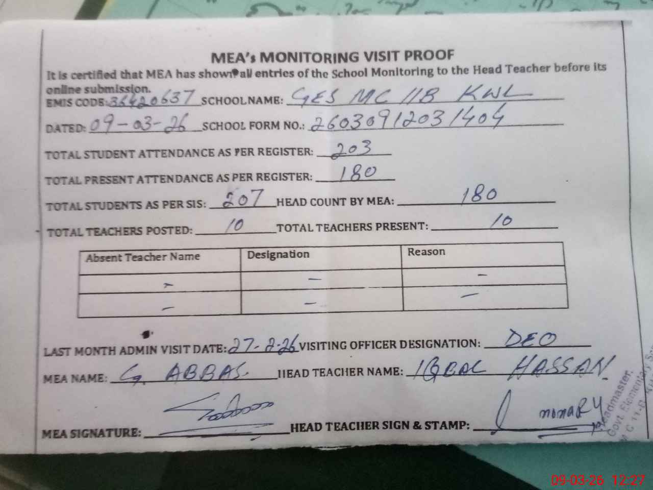 | EMIS Code: 36420637 | Name of School: GES MC 11-B KHANEWAL | |||