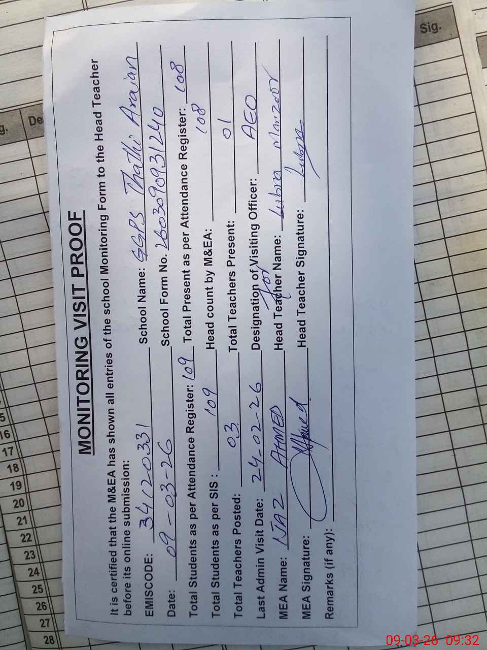 | Attendance Register | Head Teacher | MEA with School | Visit Proof |