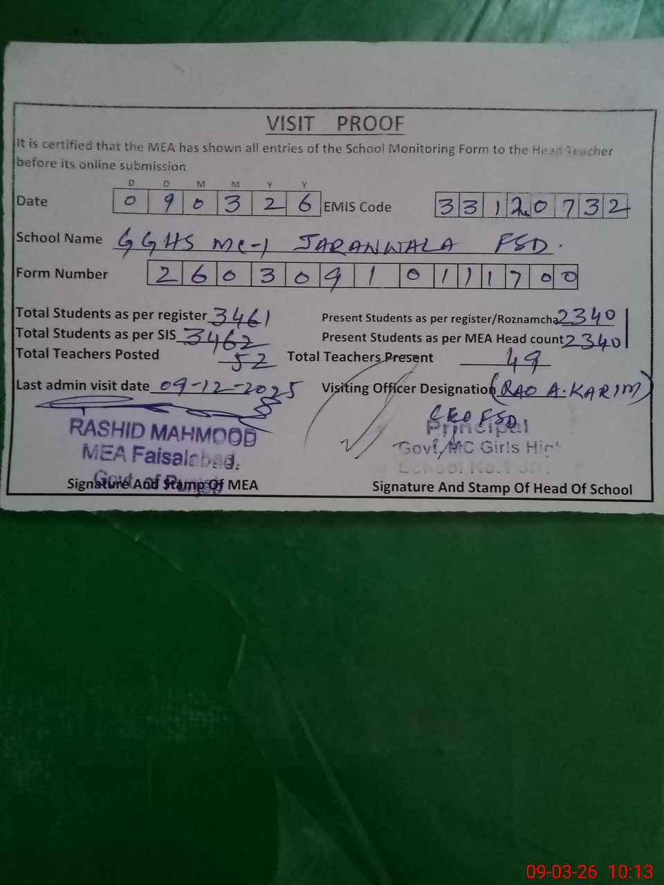 | EMIS Code: 33120732 | Name of School: GGHS MC NO.1 JARANWALA | |||