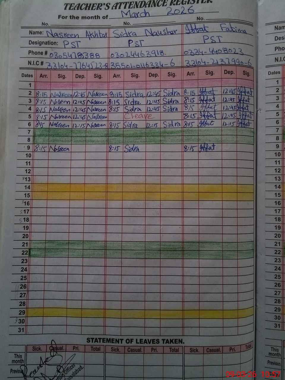 | CNIC | Full Name | Designation | R/C | Absence During Last Calender Month |