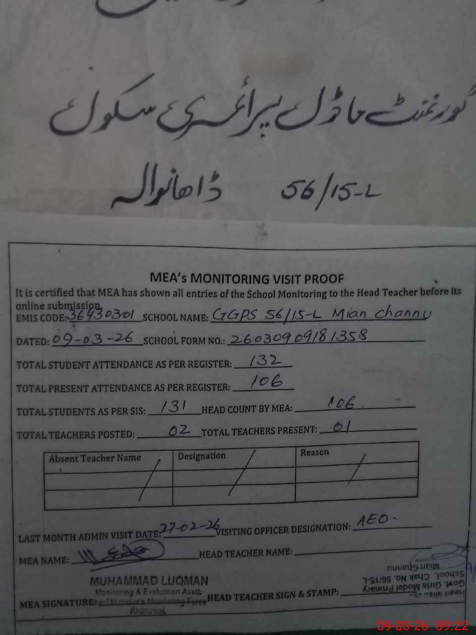 | EMIS Code: 36430301 | Name of School: GGPS 56/15-L, MIAN CHANNU | |||
