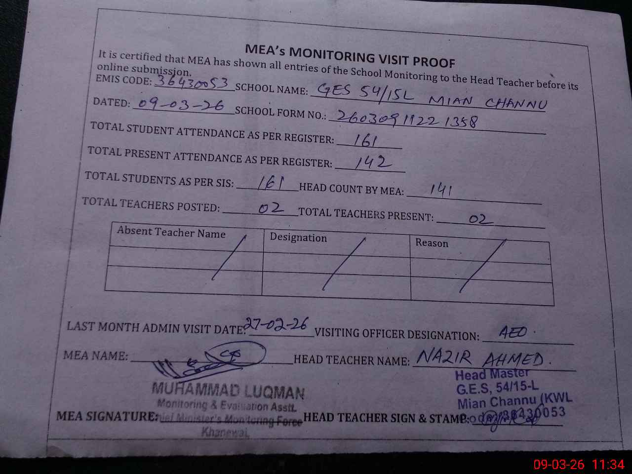| Attendance Register | Head Teacher | MEA with School | Visit Proof |
