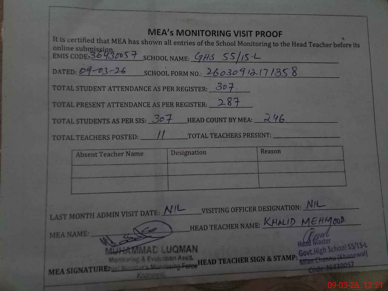 | EMIS Code: 36430057 | Name of School: GHS 55/15-L, MIAN CHANNU | |||
